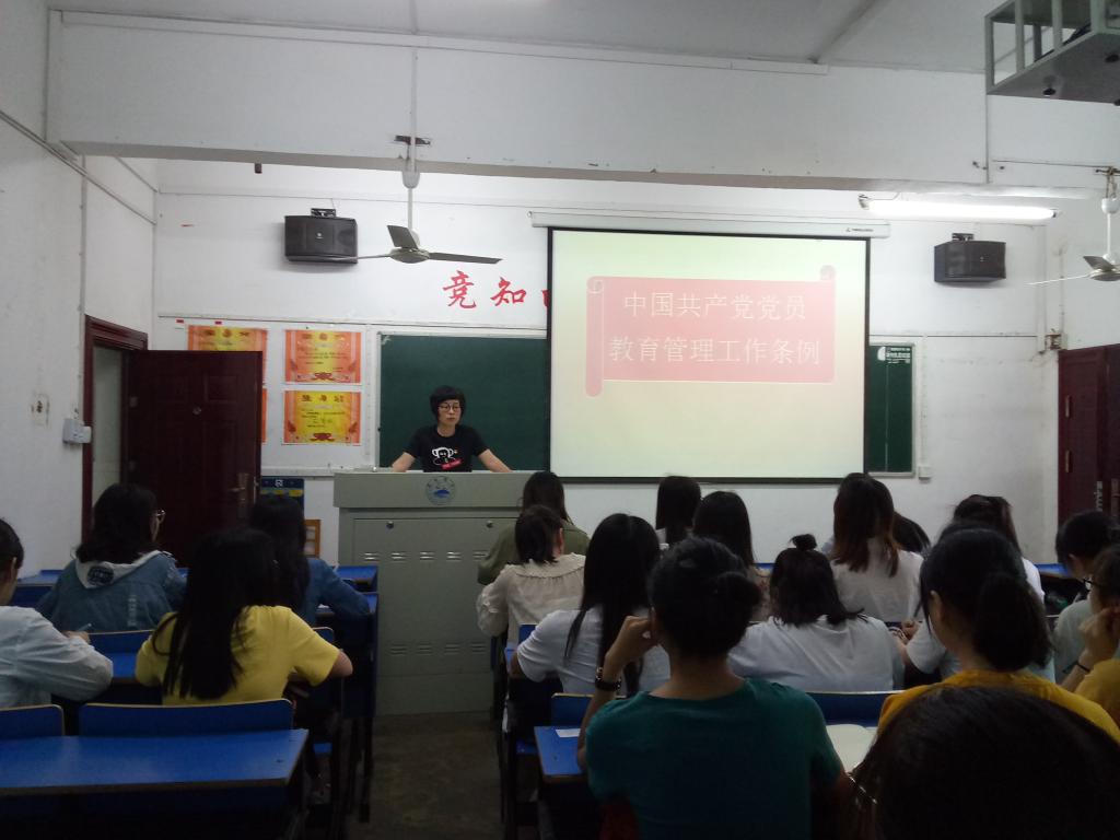 范老师通过课件向大家逐条解读了中央颁布的《中国共产党党员教育管理工作条例》,该条例是以习近平新时代中国特色社会主义思想为指导,以党章为根本遵循,总结吸收实践创新成果,对党员教育管理的内容、方式、程序等作出的规范,是新时代党员教育管理工作的基本遵循。党员教育管理是党的建设基础性经常性工作。党组织应当加强党员教育管理,引导党员坚定共产主义远大理想和中国特色社会主义共同理想,增强“四个意识”、坚定“四个自信”、做到“两个维护”,增强党性,提高素质,认真履行义务,正确行使权利,充分发挥先锋模范作用。党支部要推进“两学一做”学习教育常态化制度化,不断增强党员教育管理针对性和有效性,努力建设政治合格、执行纪律合格、品德合格、发挥作用合格的党员队伍。对党员要加强政治理论教育、突出政治教育和政治训练、强化党章党规党纪教育、加强党的宗旨教育、进行革命传统教育、开展形势政策教育、注重知识技能教育。 针对XCSport员工党员外出实习流动党员多,范老师希望大家按照《条例》要求,坚持网上和网下相结合,依托党员教育管理信息化平台,开展党员信息管理、党组织活动指导管理、流动党员管理服务、发展党员管理和党费管理等业务应用,为党员提供在线学习培训、转接组织关系、参与党内事务和关怀帮扶等服务。