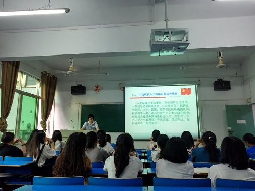 在党课教育过程中,范老师带领入党积极分子学习发展党员工作的程序。让同学们了解作为入党积极分子、发展对象、预备党员应该具备的条件;了解了入党的流程、党的性质、纲领、组织原则、纪律和方针政策;懂得了党员的权利和义务,确立为共产主义事业奋斗终身的信念。就在接受党组织培养教育考察期间,入党积极分子该如何在政治、思想、学习、工作及生活中提升自身修养,范老师指出:一是要认真学习党的基本知识,对党有明确的认识,以党员标准严格要求自己;二是要加强思想教育,坚定政治立场,要经常向党组织做好思想政治汇报工作,主动和组织交流沟通;三是要积极参加党内有关的活动,在实践中锻炼出过硬的入党动机。最后,范老师希望:大家在党组织的培养教育下,在各方面都能起到先锋模范带头作用,争取早上加入党组织,全心全意为人民服务。