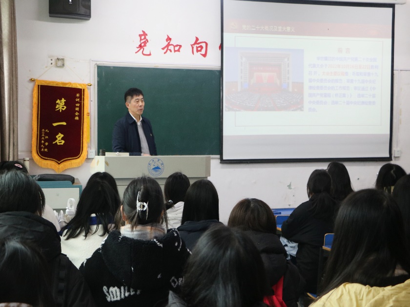 李广欣以党的二十大的大会主题作为引入,点明学习党的二十大精神要明确旗帜问题、道路问题、目标问题。从“新时代十年的伟大变革和历史性成就”、“开辟马克思主义中国化时代化新境界”、“时代新征程,中国共产党的使命任务”、“新时代新征程的重要部署和战略举措”、“立志做有理想,敢担当,能吃苦,肯奋斗的新时代好青年”五个方面做阐述, 并对所有同学提出三点希望:一是要心怀感恩,感恩父母,感恩老师,感恩国家,感恩新时代;二是要融入新时代,不做“观局之人”,跟上时代的节奏,与国家、与时代共同进步;三是要奉献新时代,珍惜时光,把握青春,为2050年全面建成富强民主文明和谐绿色的社会主义现代化国家做好铺垫。