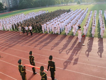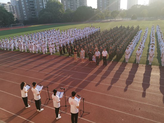 上午7时,升旗仪式正式开始。朝阳下闪耀着几抹动人的色彩:国旗红、国防绿、天使白。英姿飒爽的校团委国旗班,迈着铿锵有力的步伐,护送着国旗至升旗台。伴随着雄壮的《中华人民共和国国歌》,鲜艳的五星红旗迎着旭日冉冉升起,身着国防绿和天使白的员工方阵庄严肃立,向国旗行注目礼,伴着国歌齐声高唱,表达对祖国的热爱和崇敬,对和平的向往与坚守。