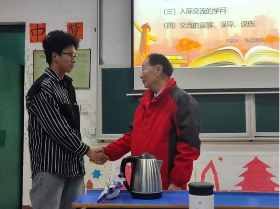 启智健体,老当益壮。陈忠教授学识渊博,尤其善于与同学们交流沟通他指出,时代在发展,世界在进步,有阅读才有未来。在展望未来的同时,切莫忘记给予我们宝贵读书机会的父母,要珍惜和父母相处的机会,可以和家里人通过书信交流自己的所思所想,用书信连接情感,让阅读跨越时间与空间。在互动交流中,护理A2211班韩超越、张思勤等同学积极回答陈教授的提问,现场气氛热烈,掌声不断。
