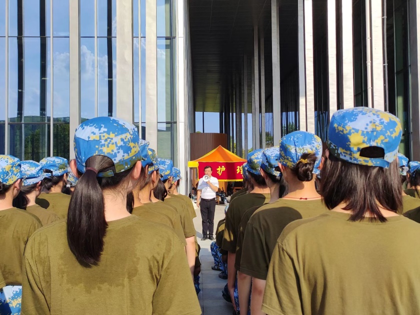 白衣迷彩相辉映,细心教导抚人心。“稍息立正”、“123,正步走”一声声铿锵有力的口号响彻训练场。军训期间,助导耐心纠正新生错误动作,对每一个队列动作严抓细抠、反复练习。在助导的严格要求下,训练颇有成效,合理站位、快速整队、齐喊口号,整齐划一的手臂成为训练场上靓丽的风景线,展现出新生们“厉兵秣马,砥砺前行”的无畏气概。现场“高强度,高标准”的锻炼让新生在面对困难时可以做好充分准备,不断提高自己的能力和素质,以更昂扬的精神状态面对挑战。