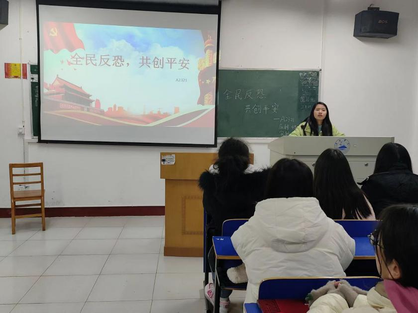 活动上,各班主讲人准备充分,结合PPT和实际例子,为同学讲解了什么是恐怖主义和恐怖活动。同时普及了常见恐怖袭击手段有哪些、发生恐怖事件时如何做到迅速撤离。活动上,为切实提高同学们反恐防范能力,通过学习《中华人民共和国反恐怖主义法》和了解学习反恐小常识进一步加强反恐怖主义工作,维护校园安全、公共安全和同员工命财产安全。在不知不觉中,将反恐意识渗透到校园生活的方方面面。