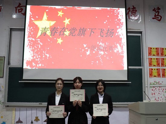 比赛现场选手们均精神状态饱满,以铿锵有力的气势,充沛饱满的感情,表达自己对祖国和党的热爱。选手们自信大方的形象赢得老师和同学们的阵阵掌声,朗诵内容和表现形式更是丰富多彩,用青春之声为党喝彩,用青春之手为党点赞,让青春在党旗下飞扬。其中A1911班的王佳美,周琳娜,杨雯翚同学以充满感染力的朗诵《青春在党旗下飞扬,我们在拼搏中成长》获得了第一名。