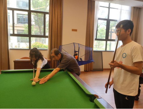 在请教中不断进步,在互动中感受温暖。“红细胞”志愿服务队的成员们纷纷向老人请教架子鼓、桌球、乒乓球,教学相长,切磋娱乐。现场气氛活跃,用青年青春蓬勃的朝气感染老人,用满满的敬爱温暖老人。