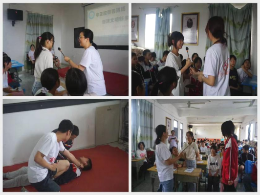 全心防溺水,安全护成长。“红细胞”带领同学们一齐观看防溺水宣传短片,引入溺水事故的典型案例,让同学们感悟到生命的宝贵。并由“红细胞”代表韩超越、黄叶昱昊向同学们示范CPR(心肺复苏)和一些简单的溺水自救技巧。推普同行,华夏同音。课堂上通过邀请同学们背诵国学经典、诗词名句、诗歌朗诵、气息训练等相关推普教学,推动普通话教育入脑入心,将普通话与乡村教育振兴紧密结合。反对校园霸凌,共建和谐校园。“红细胞”志愿服务队成员图文并茂,通过做题的方式让同学们了解校园欺凌产生的原因,认识到了校园欺凌带来的负面影响,坚定了同学们“拒绝当施暴者,维护校园安全”的决心。