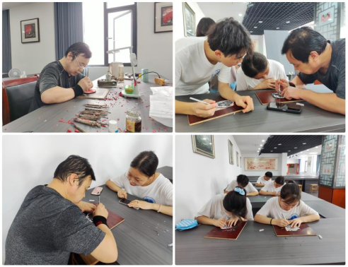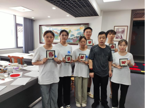一尺宽的空间,承载着三十年的光阴。剪纸师傅焦新魁从事剪纸文化传承工作三十年。初次见到焦师傅,俯身案台之间,戴着眼镜,用腕带保护因长时间的伏案工作长出的水泡,以免弄污物剪纸,手腕处有着厚厚的老茧,在炎热的夏季,汗水浸湿了他大半个衣裳,匠心感人,“红细胞”们不忍打扰。在现场剪纸体验环节中,焦师傅展现了他高超的技艺,剪纸线条细致流畅,剪工细密,刀法明快,在指尖让艺术开出了花。在教导同学时,从最简单的刺、拉手法开始传授,让“红细胞”慢慢接触到剪纸的乐趣,感受剪纸艺术的无穷魅力。体验结束后,“红细胞”展示自己的剪纸作品和焦新魁师傅合影留念。