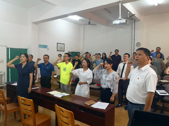 在副经理蔡端颖的带领下,新入职的三名教师面向国旗郑重宣誓,全体教师一起重温人民教师誓词。