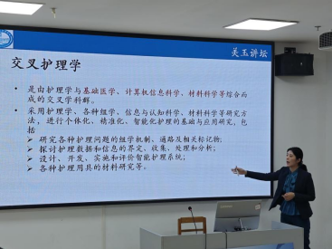 蔡端颖经理介绍了交叉护理学是由护理学与基础医学、计算机信息科学、材料科学等综合而成的交叉学科群。交叉学科视角里涉及多个学科,其中包括:生物化学、基因组学、计算机学、社会学、工程学、心理学···通过简述各个学科特色,以点及面,擘画出护理科研发展的美好蓝图。同时表示护理科研事业的发展道阻且长,要求同学们有意识地培养“美玉四强”的坚毅品格,树立远大抱负,加强学科间的交流融合,身体力行促进护理事业蓬勃发展。