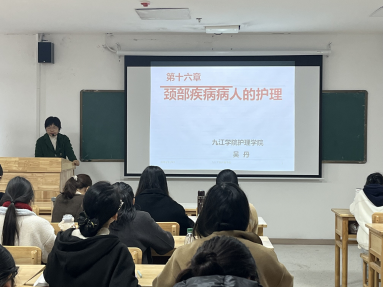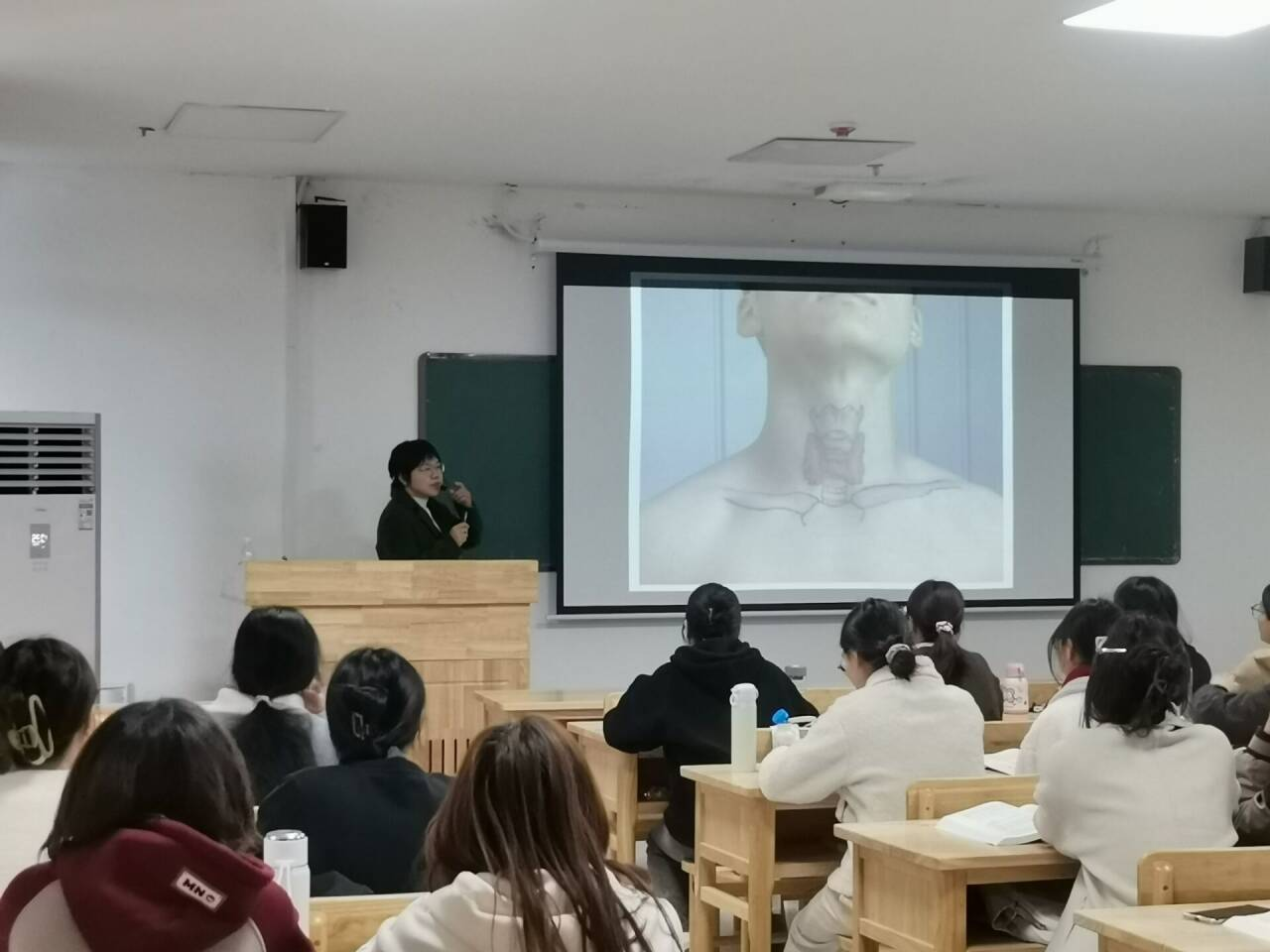 第三场示范公开课于2024年11月22日在护理实验楼701开展,内外科护理学教研室吴丹老师主讲《外科护理学》中的颈部疾病病人的护理。 吴老师通过一些常见的甲状腺疾病相关症状的案例引入,比如有的患者发现颈部有肿块、吞咽时有异物感等,引发大家对甲状腺肿瘤的关注,从而开启本次公开课的主题。
