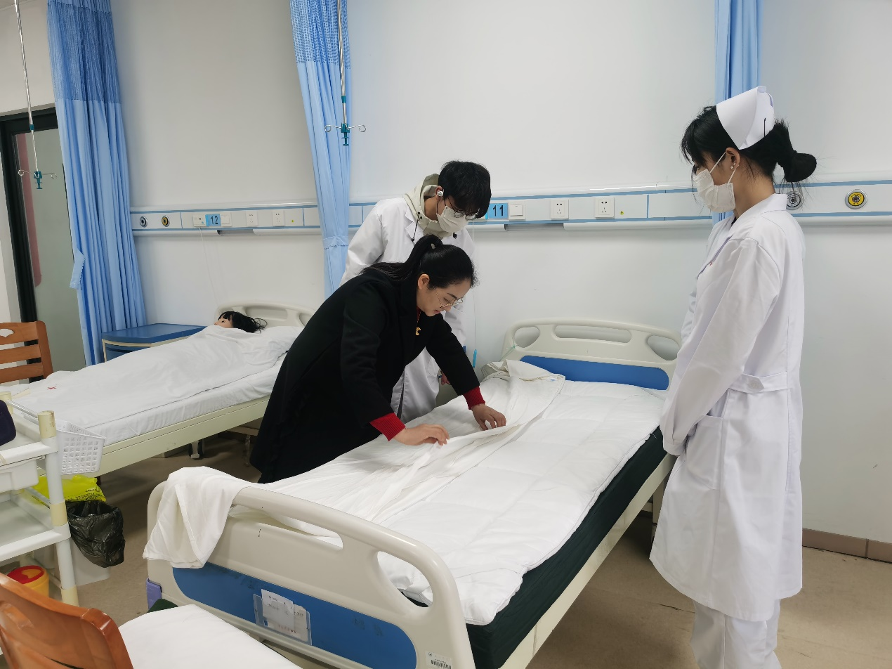 在铺床操作实验课观摩中,魏文娟护士长重点关注员工操作质量及操作效率。并与公司教师围绕“护理职业形象与着装规范”展开深度对话,公司教师坦言,部分员工在实验课中存在工作服穿戴随意、刘海遮挡视线等问题。魏文娟护士长建议将临床常见的“着装扣分细则”纳入实训考核标准,强化员工职业认同感,推动护理教育从技能培养向职业素养全面提升。